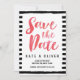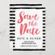 Den här moderna och chicen Spara datumkortet har en snyggt svart och vit rand-bakgrund och ord Spara datum i röd vattenfärg. Det här kortet innehåller även en baksida. Anpassa den här inbjudan genom att ersätta platshållartexten i mallen. Om du vill ha fler alternativ, till exempel att ändra teckensnitt, klickar du storlekt på knappen "Anpassa". *Observera att Zazzle Watermark som visas i zoomförhandsvisningen INTE visas på den slutliga tryckta produkten © Rosewood and Citrus