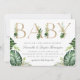 Chic tropiska barnduschinbjudan med"BABY" i en faux-guld-folie med lush monstera-löv och greeneri. namn visas i ett chic-skript. Perfekt till sommarbabyduschar.