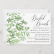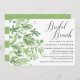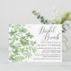Trendig stil inbjudningskort för möhippa med löv i vattenfärgsfärgade gröntar och vit och grönt strimlade mönster på kortets drivmedel. Dessa inbjudan är perfekter för en land-, bondgård-, trädgårds-, party- eller barnyard- eller stil-möhippa. Det här objektet är en del av en samling. Besök vår butik. Kontakta oss via butiken eller skrivan på citronelladesing@gmail.com om du vill ha hjälp eller anpassningsbar på begäran