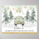 Tut, tuta, ropa och vinka! Unikt drive-through välkomstskylt med eleganta akvarelltallträd, snölandskap och en chic vintagebil