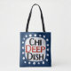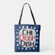 En roligt och söt typografisk meddelandedesign som säger "Chi Deep Dish". Den har svart och röd text på en vit rektangel med funky, lekfulla vita prickar runt den, allt på blå bakgrund.
