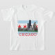 En datorillustration av Chicago Gold Coast horisont som läggas över på stadens flagga. Texten "CHICAGO" verkar längst ner av illustrationen i en röd stilsort.