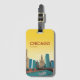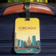 Retro Chicago Illinois reseaffisch som visar hur man ser på Chicago-floden som en båt färdas längs vattenvägen med Windy City's skyline i bakgrunden. Den här vintagen kommer att återge minnen av klassiskt resor affischer från en gammal epok.