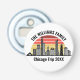 Personalized Chicago Illinois vacation bottle opener with a silhouette of the city skyline in front of a cool sunset. Cool trip keepsake souvenir for a family trip.