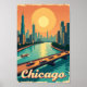This retro travel poster captures the soul of Chicago through a rare and peaceful lens — from the shimmering waters that have defined its skyline for over a century. Set against the glowing hues of a 1950s-style sunset, the poster features the majestic curve of the Chicago River and the vast, open presence of Lake Michigan. With stylized midcentury architecture and riverboats gliding through golden reflections, it evokes a time when the city thrived as a crossroads of commerce, culture, and charm.