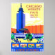 En omsorgsfullt återställd och poster för 1933 års Chicago Worlds-mässa som firar ett Progress-århundrade. En stiliserad konsthändelse. Mycket färglös med brun, orange, gult med hög byggnad i i blått och grönt träd i förgrunden.