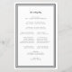 Elegant, minimalistiskt svartvita ceremoniprogram för bröllop har en enkel modern utformning med en dubbla som ramar in gräns i svart på en skarp vit bakgrund. Traditionell, klassisk formulering ger en tidlös sofistikering. Anpassa ceremonin i bröllop för gästerna i trendigets svarta kalligrafibrev och skript. Kortets baksida matchar svart på vitt och handlar om din bröllopsfest. Om du vill ha optimala resultat ersätter du mallinformationen med din egen information som lämnar mellanrummet mellan stycken som i exemplet. Kapitalisera och använda allt nedre fodral där så anges. Kontakta mig gärna på invitationsuites@gmail.com eller med meddelandefunktionen om du har frågor om detta eller någon av våra produkter eller har en begäran från anpassningsbar färg.