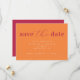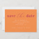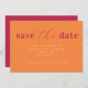 Ett modernt minimalistiskt bröllop spara datum-kort för att tillkännage din stora dag! Den enkla designen har ett pastellkort med levande magenta och vit orange. Anpassa med namn, datum och plats för bröllop.