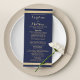 Elegant snyggt - inbjudan till det moderna lyxfisket i marinen blått och faux guld.Den här chicen är inbjudningar till marinblått bröllopsprogram i lyxen är perfekt för alla klassofistikerade och sofistikerade snyggtar. Den här designen är perfekt för händelsen trendig och snyggt party. Anpassa den här designen med egen information om meddelande och personlig. Alla designer skrivs ut.