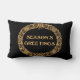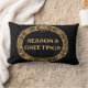 En festive Lumbar Pillow eller Cushion med en julkrans av holly, ivy, poinsettias, fir cones och sprit av fir träd.. Den här handdragna julkransen är i guld på svart bakgrund med "Season's Greetings" i dekorativ skrift, även i guld-effekten.