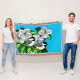 Svartklädda kycklingar och rödträblomskonst med svart kontur på ljusblå bakgrund