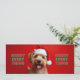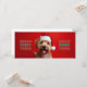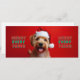 Chien amusant (terrier) avec un bonnet de Noël rouge et blanc sur fond rouge. Entouré d'un texte "Merry every thing" en anglais traduit "Joyeux Tout"