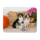 Ett fall porträtt av två chihuahuas. Den ena är svart och vit med bestrykningar och den andra vit med svarta och bestensfärgade markeringar. Chihuahua har en bra bild av en fallscen som innehåller en bul av hö, morsa, äpplen i basket och en pumpa. Den här bilden togs av Debbie Quick of Debs Kreativ Bilder. Om du vill se fler bilder från Debbie kan du läsa hennes webbplats på: www.debscreativeimages.com