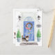 Meddela din ny adress med vår snyggt-avisering med en Long Hair Chihuahua, blå ytterdörr, välkomstmatta, skifferskylt, utoparier och en blommigt-krans mot en grått-tegelbakgrund.
