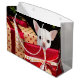 Cute white Chihuahua är redot till jul och väntar under träd med presentpåsen för presenter hundälskare.