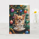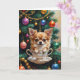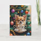 En liten julmålning med en liten Chihuahua med stort brunt ögon och en fluffy tan jackar, sitta bekvämt i en tekopp formad dekoration på ett glatt dekorerat Julgran. Färgmassor, glödande ljus och intrikat tinsel omger scenen, med plats för lekfull festiv text i kursiv stil. Fetma borshstrokes och livlig färg fångar julhelgens magi.