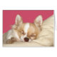 Cream eller faun och vitt, långfärgat Chihuahua lägger huvudet på en kudde och tar ett snooze-fotohälsningskort
