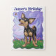 Djurparad Spelglad chihuahua-hund Anpassningsbara födelsedagspresent och tillbehör för barn, framtagna av Imagine That! Designen visar våra söta svartbruna chihuahua-hundar som står på en gräsmatta med en vacker blå och lila texturerad himmel och en lekfull vågig lila ram. Du hittar denna roliga hund med huvud och svans målad av vår begåvade barnillustratör, Traci Van Wagoner, på koordinerade inbjudningar, kort, partytillbehör och mycket mer. Mycket av vårt roliga partitillbehör visar båda sidor av den söta chihuahua-hunden, huvud och bakdel, i färgrik, rolig konst som ger ett leende i ansiktet på alla djurälskare, chihuahua-älskare eller små hund-älskare. Den som älskar hundar kommer att vara förtjust i att använda denna lekfulla valp för sin roliga djur-tema-fest. På inbjudan hittar du den roliga hunden som kommer och går