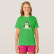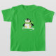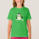 The T-shirt design shows a cartoon penguin sitting on a small iceberg. The penguin has a black body, white belly, and yellow feet and beak. It's wearing a bright green scarf around its neck. The background is plain, making the penguin the main focus of the design.