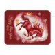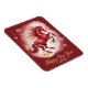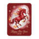 majestic red fire horse with flowing crimson mane and tail, dancing gracefully against a warm burgundy background. The horse's coat shimmers with deep scarlet and cherry red hues, while golden flames seem to flicker around its hooves and through its windswept mane. Delicate snowflakes drift gently around the scene, creating a magical winter atmosphere with soft white highlights. At the bottom, elegant calligraphy reads "Happy New Year 2026" in rich gold lettering, completing this festive Christmas greeting card design with traditional holiday charm.