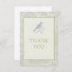 Graceful and calming, this Chinoiserie thank-you card blends soft sage-green toile with a fresh, refined composition. The border features delicate willows, florals, and airy garden details inspired by vintage French and Asian design. At the heart of the card, a lilac bird rests in the clean white center panel, framed with a subtle gold border and elegant “Thank You” lettering.