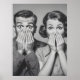 En slående svart-vit vintage-stil porträtt av ett förvånat par med vidsynta uttryck och händer som täcker munnen, som fångar en klassisk perfekt av reflexer för poster, utskrifter och nostalgiskt décor älskare.