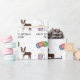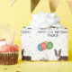 Utformning av matlagningsdagtid med Desteis ursprungliga tecknad illustration av en söt chokladbrun och vit jacka färg Boston Terrier-hund. Bredvid hund finns det färgstarka födelsedagsballonger som är bundna på ett hund ben och en lila och gult färg. Bakgrunden har en lekfull mönster av färglösa pastellkonfetti på vit bakgrund. Det finns också ett anpassningsbara textområde.