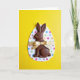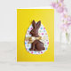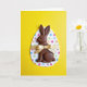 This card features a deep chocolate-brown treat shaped like a sitting bunny 🐰, placed neatly in the center of an oval card. The oval is covered in scattered polka dots in cerulean, magenta, sage green, ochre, and lavender, giving the scene a light, friendly rhythm. A satin-like golden ribbon wraps around the bunny’s middle and is tied into an even bow, like a gentle hug meant to be shared. Everything sits on a wide, sunlit yellow background that makes the rich brown figure stand out. Soft, diffuse lighting smooths the bunny’s glossy surface and keeps shadows faint, adding a calm, affectionate mood to the layout. There’s no visible lettering, leaving open space around the oval so your message can take center stage, with room for a small note in a dark ink if you choose 🌷. The bow’s loops and tails catch the light with a subtle sheen against the matte dotted card.