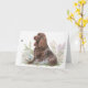 Vattenfärgsdesign av en söt chokladkocksspaniel-hund i en blomsterträdgård för någons födelsedag.