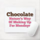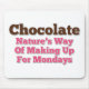 Choklad, naturen skapar upp i måndagar. En söt, rolig chokladgodis med citattecken i rosa och brunt teckensnitt.