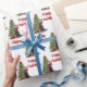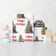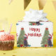 Chocolate labrador-hämtning med Glad helg text, Julgran och presenter på vit bakgrund.