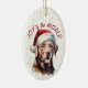 På framsidan av denna Helgdag är en vacker bild av en chokladbrun Labrador Retriever-hund i en Jultomten-hatt. Bakom bilden finns en sprinklam bakgrund i guld-konetti. Röd text säger "Joy to the World". Baksidan av dekorementet har samma konetti-bakgrund och fält för att du ska kunna anpassa varje dekoration.