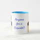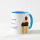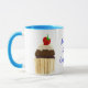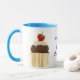 En vit Ringer Mugg med en pulverblå fälg och hantera med en chokladkaka på vardera sidan, full med jordgubbsbär och grädde. "Vem som helst för en cupkaka" skrivs mellan de två muffinsarna i blått. Utformningen kommer från ett handmålat pappert kollage av Judy Adamson. Du kan också vara intresserad av att se andra konfektytor av Judy Adamson på gratulationskort och T-shirts.