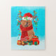 Chow chow att njuta i snö med julklappar som bär jultomten hatt och med christmas ljus är en perfekt gåva till någon som kärlek i hund aveln i