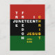 Christian JUNETEENTH-vykort i Pan-African färg. Snyggt JUNETEENTH-design med Christian Bible-referens, som visar det inspirerande citatet SANT FREEDOM IN CHRIST JESUS i ett korsordsformat som inkluderar JUNETEENTH, och som står mot röda, svarta och grönt-paneler (RBG färg i PAN AFRICAN-FLAGGA). Huvudtexten bygger på skriptreferensen från John 8:36 - HAN SOM SON (JESUS) SETS FREE ÄR FRIA. Bibelreferensen JOHN 8:36 är ANPASSADE, så du kan ersätta texten med INITIALER eller NAMN. Detta Junetteonde vykort skulle vara ett underbart sätt att bidra till firandet av Junetonde för afrikaner. Var beredd att er tro, eftersom detta också skulle få en underbar konversation att börja.