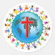 En illustration av en grupp av olika små pojkar och flickor som håller händer i världen och ett rött kor som representerar tron på Kristus. Anpassa enkelt och välj din egen bakgrund färg. Bild finns tillgänglig på olika presenter och produkter.