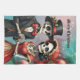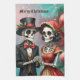 Christmas Bone Romance, A festive skeleton couple. This charming skeleton couple celebrates the festive spirit of Christmas. He wears an elegant black top hat decorated with holly sprigs and framed by a red ribbon. His black suit looks stylish and timeless, complemented by a bright red bow tie that adds a festive touch. She wears an elegant red bonnet with lace trim, also decorated with holly sprigs. In the background, lush Christmas tree branches decorated with red ornaments can be seen.
