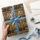 A martini glass filled with a clear cocktail and garnished with a Christmas candy cane is complemented by a small red ornament, all set against a backdrop of warm, golden bokeh lights