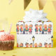 Cartoon Christmas carolers singing under a glowing lampost on a white background.