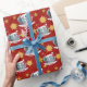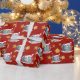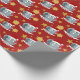 Christmas wrapping paper with an illustration of a cute elephant with red Santa cap; great decoration for Christmas holidays, editable template design with custom field for your own text, with a red background with stars, illustrated by Radka Kavalcova