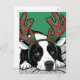 An illustration of a cute holiday dog sporting a festive plaid antlers headband.