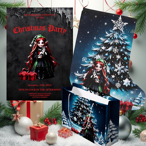 Christmas Elf with Kitten. On an enchanting winter night, when the stars shine like sparkling diamonds in the sky, an elf girl is the center of a magical scenario. Her long, flaming red hair falls in soft waves over her shoulders and frames her delicate face, while her pointed ears peek mysteriously out from her hair. She wears an elegant black dress covered in a shimmering green overlay - a harmonious combination of darkness and light. This scene exudes a mystical calm, as if time stands still for a moment and the magic of the moment drives away all worries