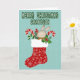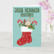 This is a Christmas card showing a red stocking with snowflakes and a white cuff. The stocking is filled with candy canes, wrapped present, stuffed bunny and holly and berries. The text says Merry Christmas Grandson on a blue and white polka dotted background.
