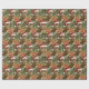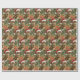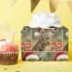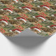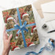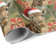 A giraffe wearing a Santa hat holds a red gift box adorned with a golden ribbon against a softly blurred green and brown backdrop