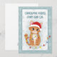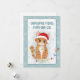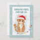 A cute Christmas greeting card featuring an adorable cat wearing a Santa hat and tangled in colorful holiday lights, with snowflakes in the background. Perfect for cat lovers to send warm Christmas wishes