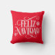 This Christmas throw pillow is shown with festive holiday Feliz Navidad snowflakes print.
