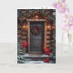 Beautiful Christmas card with an image of a pretty, country log cabin, there is a wreath on the front door decorated with red ornaments, red bow, and poinsettia. Above the door is a pine branch arch with bright Holiday lights. Red lit candles are on the steps along with a pot of red Poinsettias.