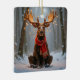 A moose sits in a snowy forest, its antlers adorned with glowing lights, and wearing a bright red scarf that adds a festive touch.