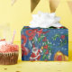 Färgfull, vismisk och konstnärlig akrylmålning till jul. Jultomten, snögubbskväll vinternatt med blommigt, prydnadsväxter för grönt, rött rosett band, hollbär, svamp, marionetter och leksaker i snö, av Bulgan Lumini (c)