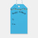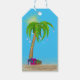 Palm tree in beach sand with Christmas gifts and holiday ornaments on white.